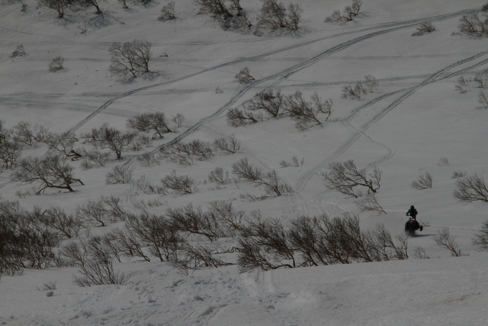 Рев снегоходов срабатывает в этих местах, как будильник. Резкие звуки вспугивают птиц — они разлетаются так быстро, что успеваешь разглядеть или совсем общие очертания, или только одну деталь — красные лапы. Зайцы бросают завтракать корой и бегут от шума куда глаза глядят, медведи на всякий случай зарываются глубже в снег вместо того, чтобы проснуться. Мы без стука врываемся в царственные покои вулкана Баранского.
