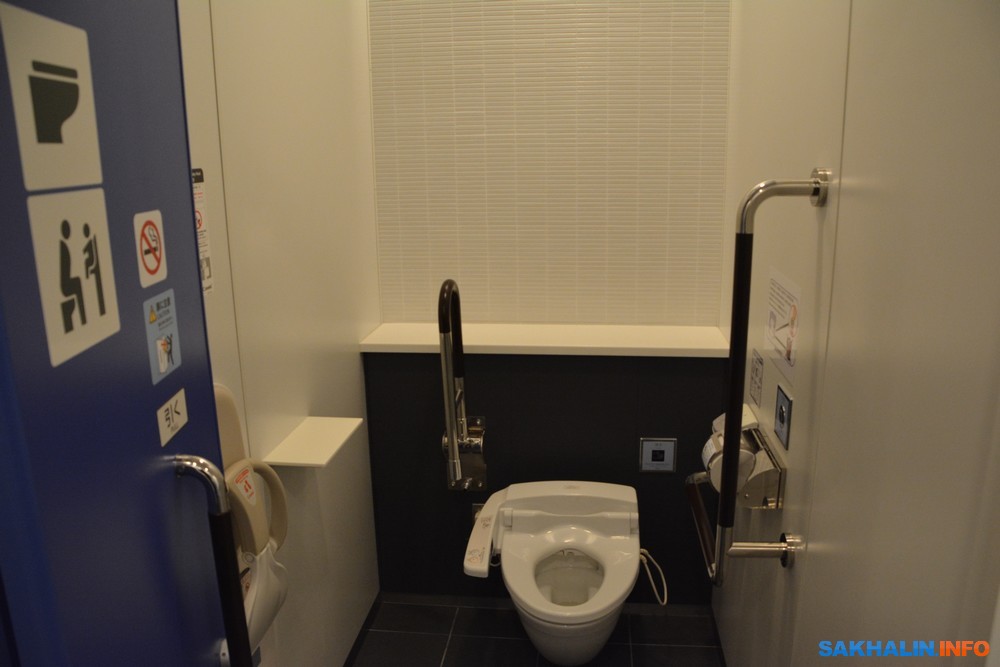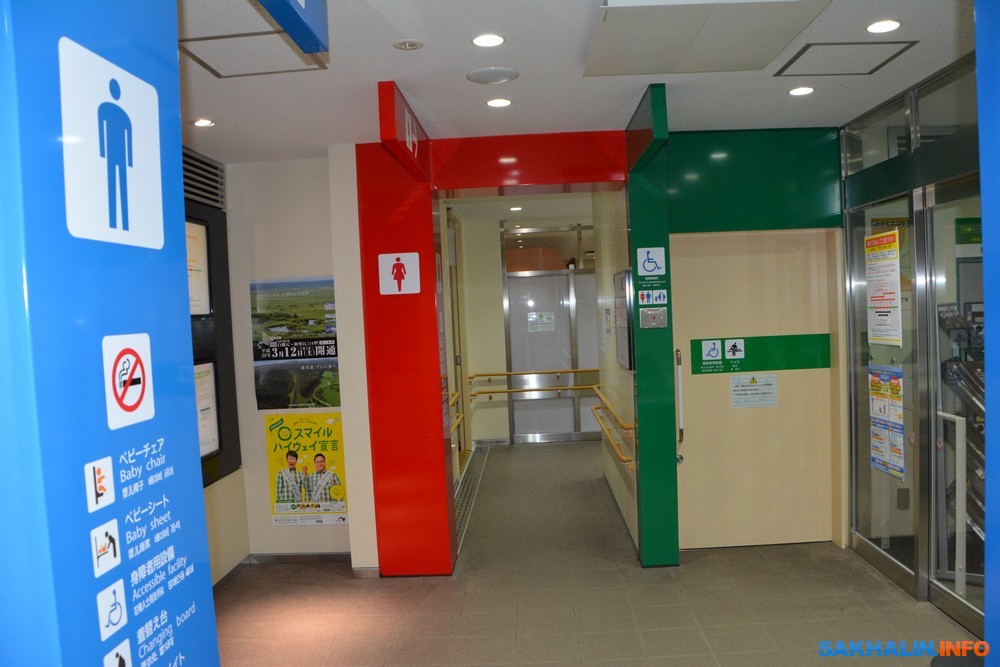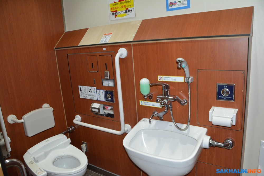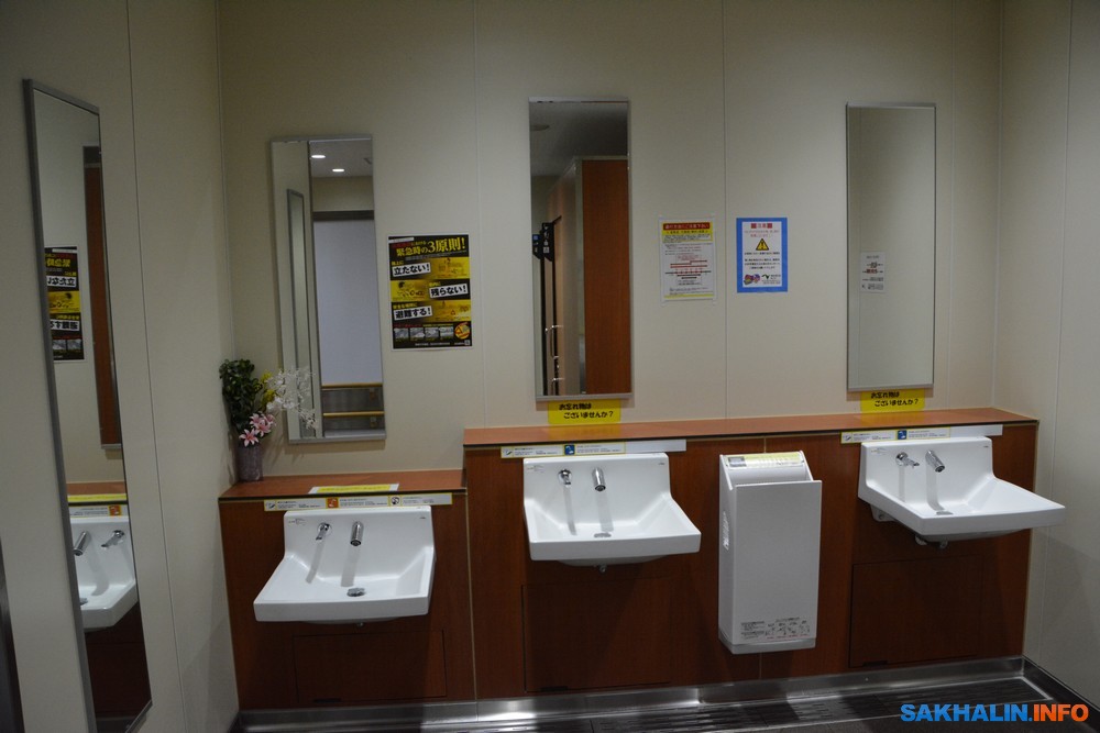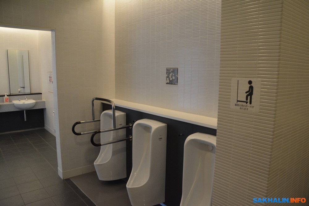 Туалеты максимально приспособлены для людей с ограничениями в здоровье. Раковины для умывания расположены на разной высоте — удобно для детей и инвалидов в колясках.
