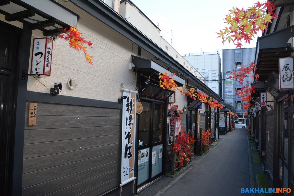 Внимание привлекают "забегаловки" — ряды маленьких кафе на 8-10 человек каждое, стоящие один к одному — стенка в стенку. После трудового дня японцы весело общаются в них за кружкой пива или стаканчиком саке. Лапша рамен — японское блюдо из пшеничной муки на наваристом курином или рыбном бульоне, обладающее большой энергетической ценностью и хорошим вкусом, готовится тут же за их спиной.