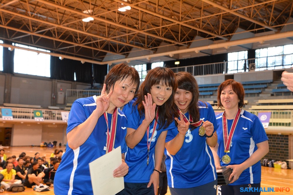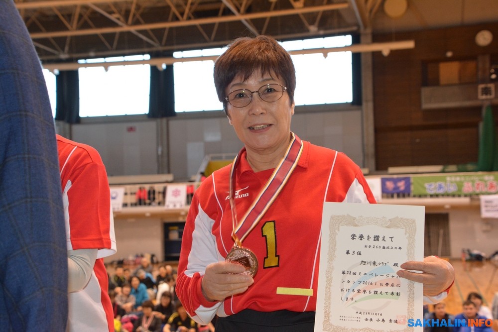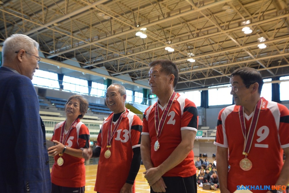 Затем состоялось награждение памятными дипломами и сувенирами старейших членов ассоциации. Среди них игроки, которые вместе на спортивной площадке 25-30 лет, в том числе супруги Араие Каёки (73 года) и Митсуо Араие (74 года). Они не раз приезжали на Сахалин, продолжают занятия мини-волейболом и своим примером демонстрируют здоровый образ жизни и спортивное долголетие.