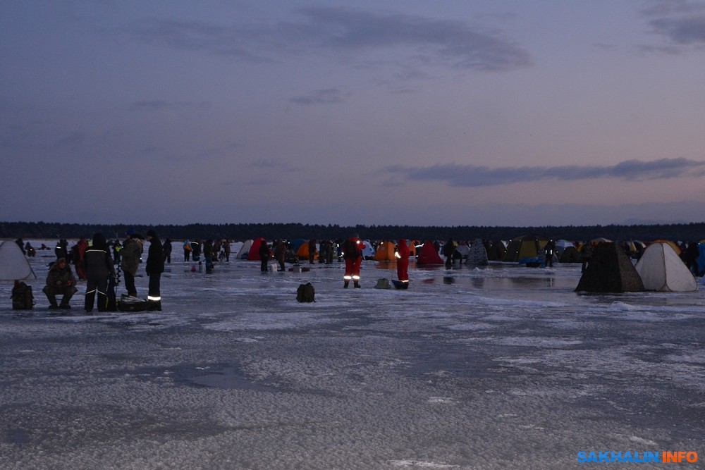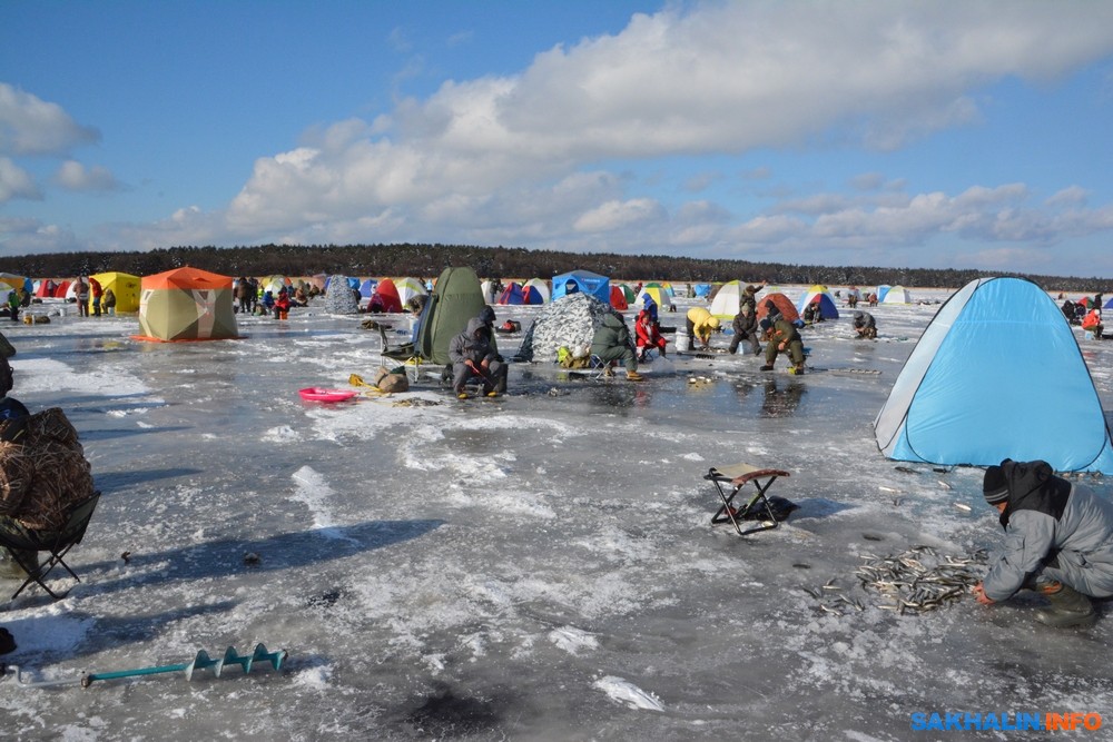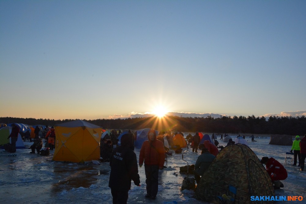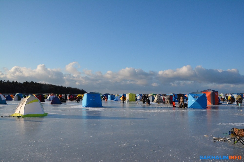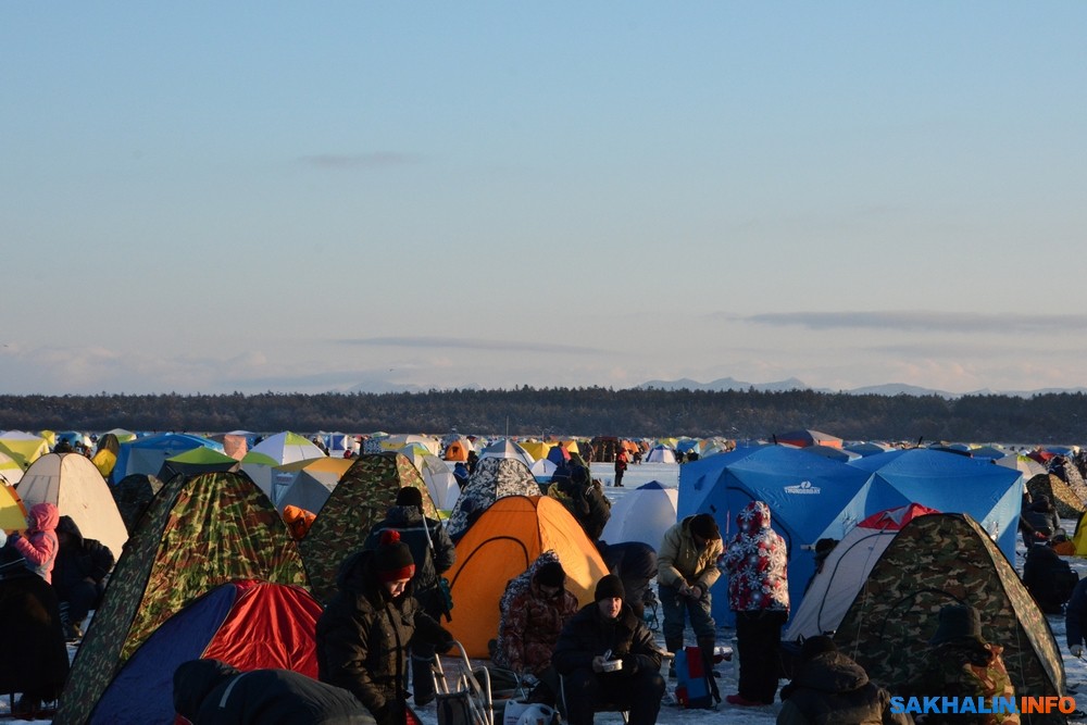 На льду уж выстроен целый город из разноцветных разновеликих палаток. Всюду скрежет буров, салазок по льду.