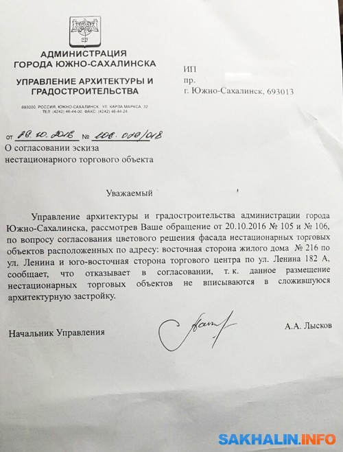 Предприниматель направил пакет документов с визуализацией объектов в ДАГИЗ, который занимался согласованием дизайна павильонов, поставил в известность департамент продовольственных ресурсов. Параллельно с этим нашел место под первый киоск — на углу улиц Ленина и Хабаровской, почти напротив УМВД. Павильон по договоренности с ТСЖ на условиях аренды и дальнейшего облагораживания этого пятачка должен был встать восточнее дома №216 по Ленина на придворовой территории пятиэтажки. На месте долгие годы находилась стихийная парковка. Проблемы у предпринимателя начались почти сразу.