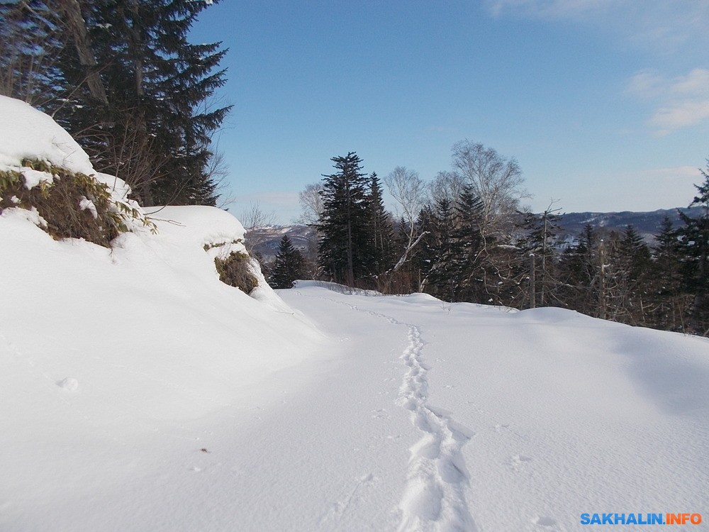 В 8:40 выехал рейсовым автобусом, следовавшим в Холмск. В 9:30 высадился из автобуса на площадке за Высоким, затем пройдя по трассе до нужного поворота. После 10 часов, надев снегоступы, повернул на нужную боковую дорогу, правда, засыпанную снегом. В итоге прошёл по целине 3,3 км, в основном вверх, со скоростью 1 км/час. Глубина моих следов в среднем составляла 10 см, что сравнительно немного — снег был подсевшим. Около 13:30, подойдя к горе Пушкина, решил разворачиваться, чтобы успеть вернуться засветло, и пока температура воздуха не особенно упадёт.