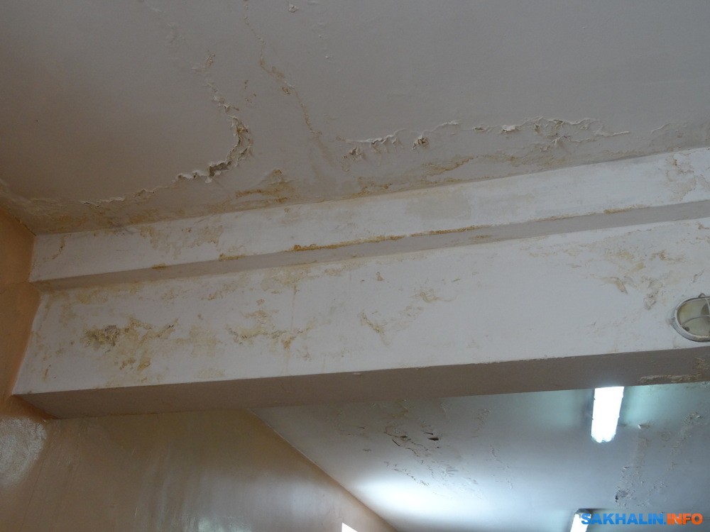 Во второй половине обитают водители, постоянно жалующиеся на капель с потолка. Новую кровлю здесь сделали года три назад, прежняя напоминала сито. В первоначальном проекте, который был создан еще до нынешнего главврача, говорилось о плоской крыше, но затем, учитывая погодные особенности, УКС предложил сделать скатную. Ее сделали и получили неожиданный эффект: весной, летом и осенью во время дождей с потолка не течет, а зимой — постоянно. Отдыхающие на кушетках водители заодно принимают легкий освежающий душ. На потолке и стенах — подтеки и отставшая штукатурка.