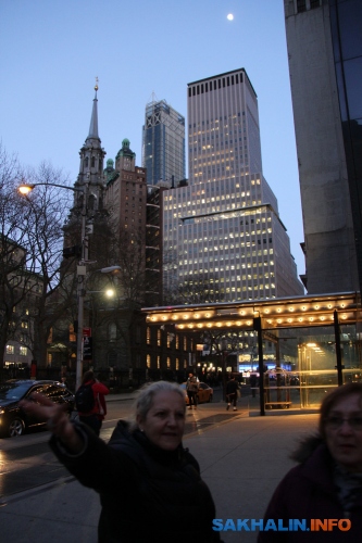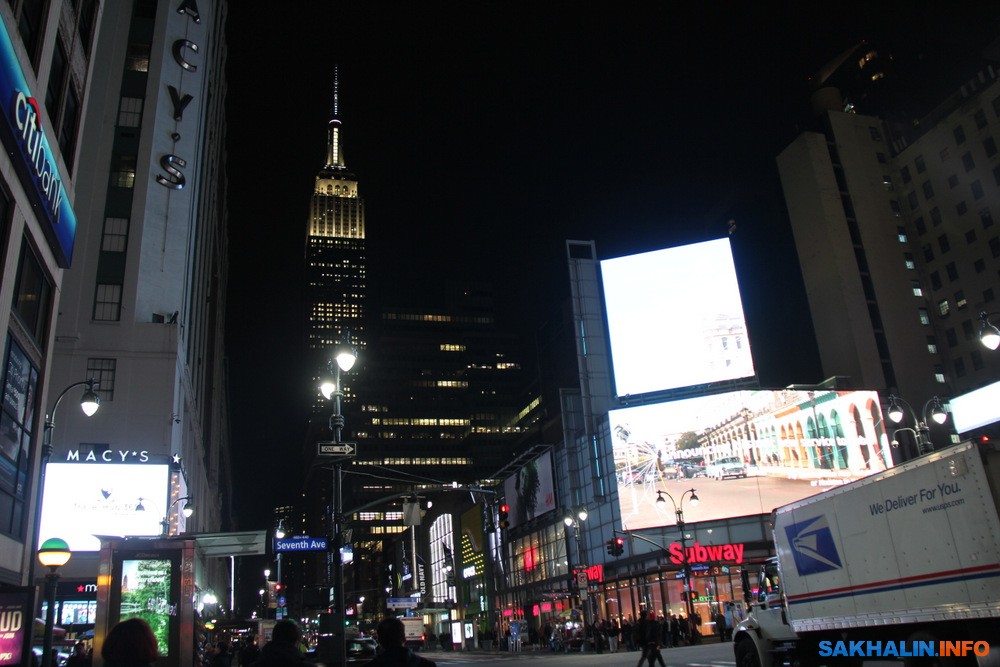 Прибываем вечером. На вокзале толкучка, очень много людей. Но на улице их еще больше: станция, на которой мы сошли, находится практически в центре Манхэттена, одного из пяти районов Нью-Йорка, в котором сегодня проживают более восьми миллионов человек (в Вашингтоне — около 600 тысяч). Первое, на что обращаешь внимание, яркая вывеска: