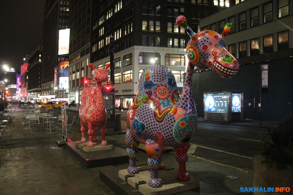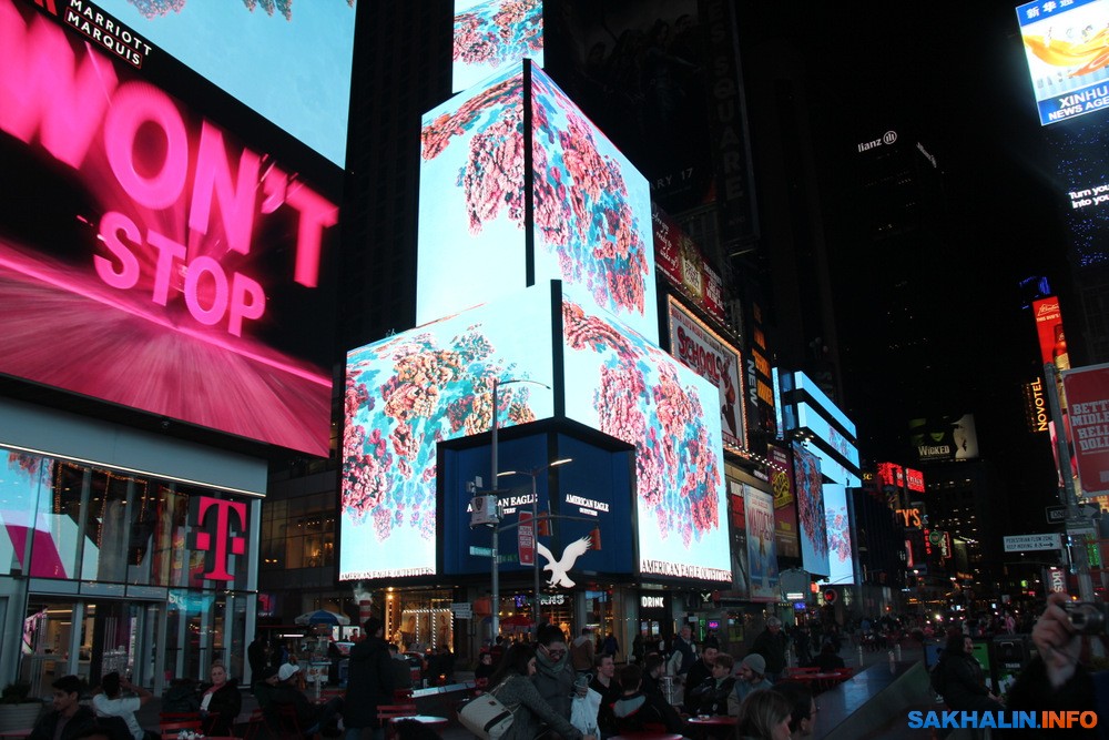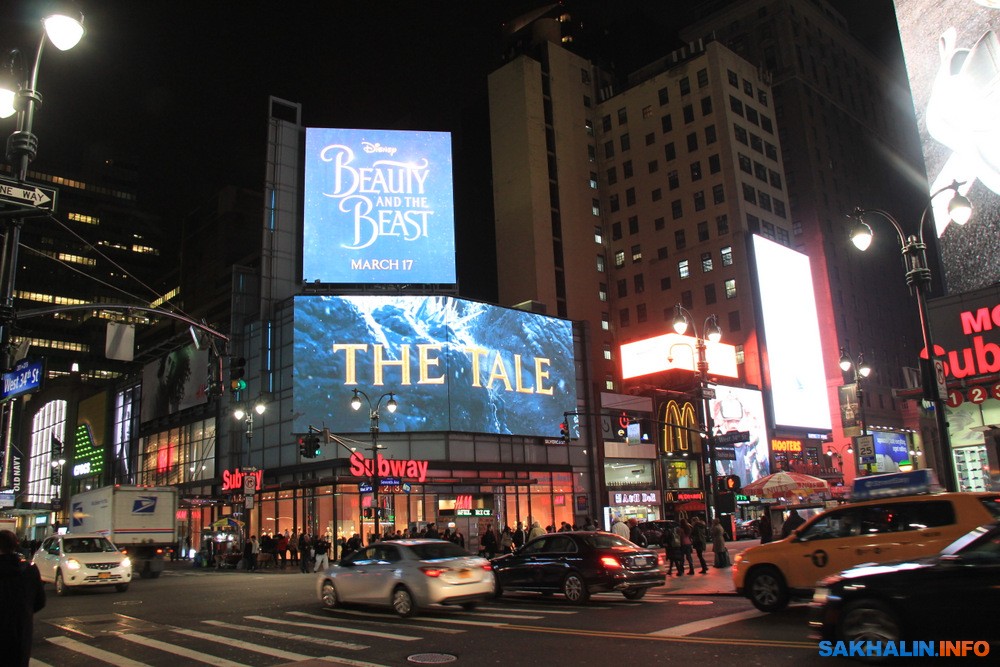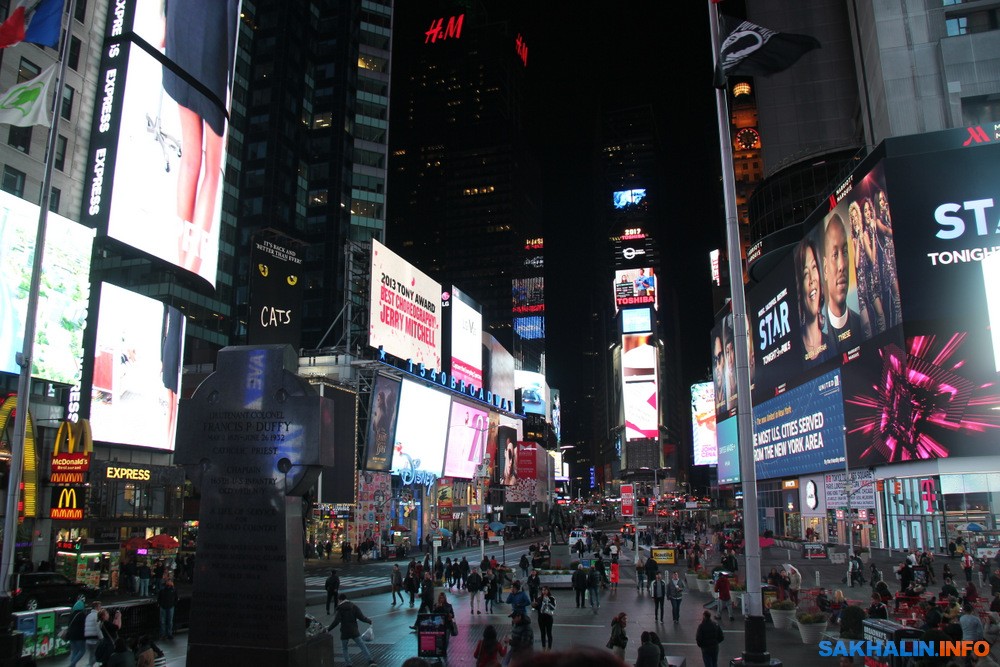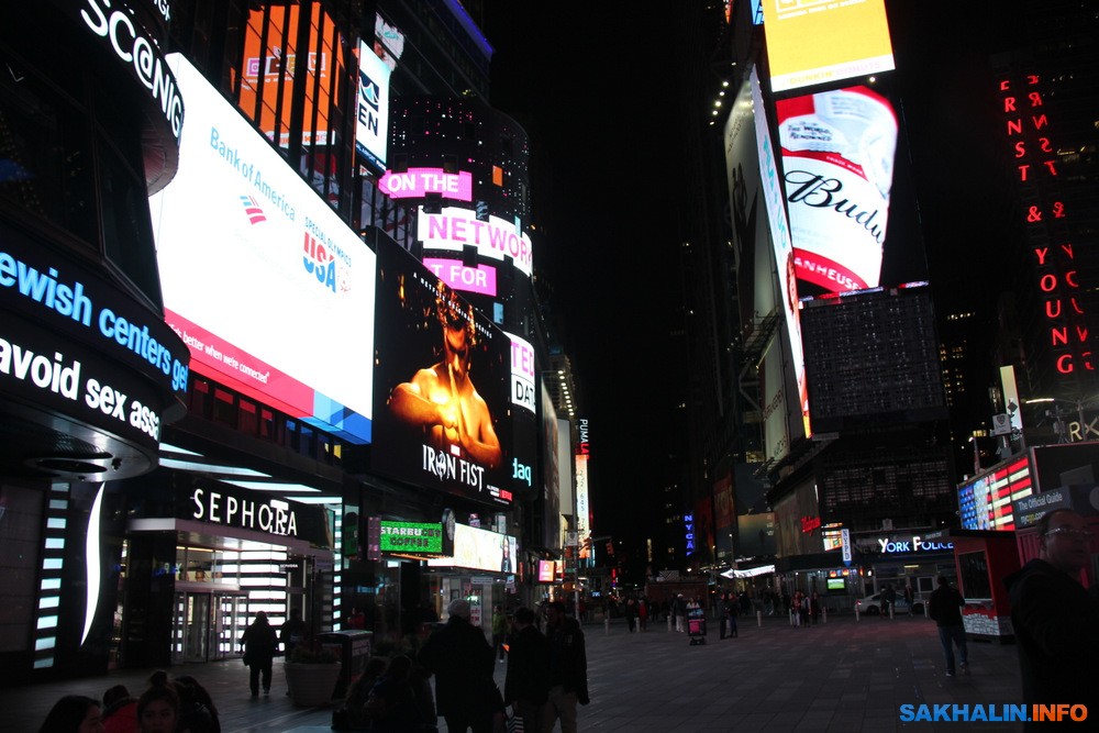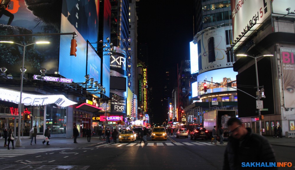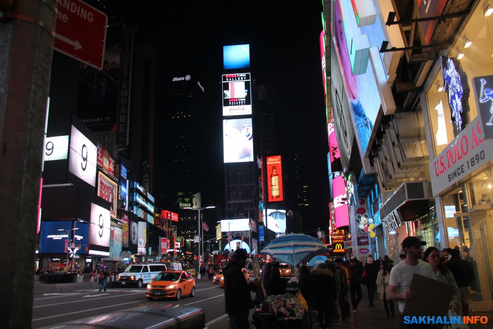 Это Бродвей, самая длинная улица Нью-Йорка, которая привела нас на Times Square, в центр Манхэттена и в центр мира, как называют эту главную театральную площадь. Таймс-сквер полностью поддерживает фразу о том, что Нью-Йорк — это город, который никогда не спит. Посмотрите, разве здесь возможно уснуть?