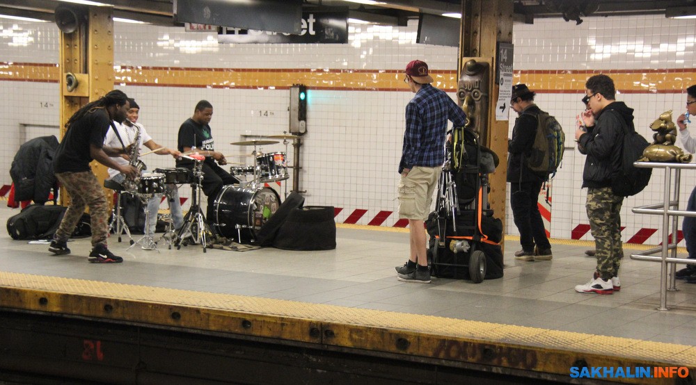 Ньюйоркское метро. В нем все еще больше или так же запутано, как в метро Вашингтона, но зато поездка стоит одинаково на всех направлениях — 3 доллара. Перед тем как спускаться сюда, надо, во-первых, хорошо изучить принцип работы (есть поезда, которые останавливаются не на каждой станции, а через три), а во-вторых, настроиться на то, что в некоторых местах придется зажимать нос, спасаясь от удушливого запаха мочи. Свой вклад в амбре вносят все те же нищие, которые тут живут или ночуют. Так как, как я уже говорила, здесь всем на все плевать, их особенно не гоняют. Зато приятным бонусом к моменту, что вы не взяли с собой платок, чтобы прикрыть лицо, или вышли не на той станции, может стать неожиданный (и классный) подземный джазовый концерт.