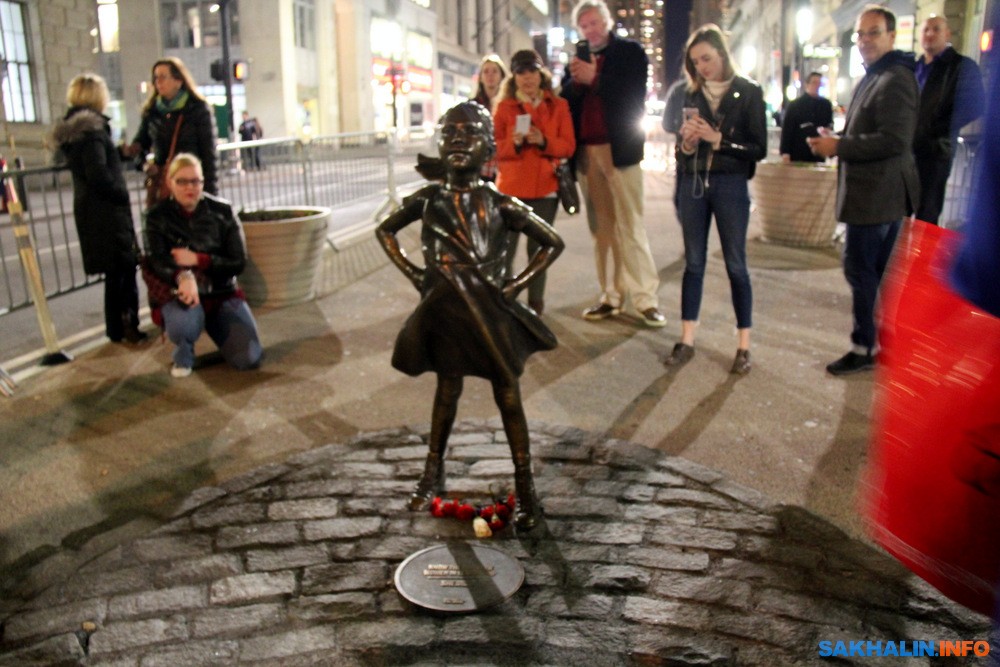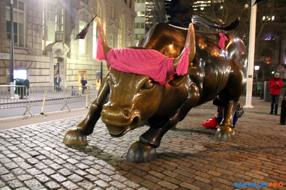 Выходим к менее популярной, но все же известной скульптуре "Атакующий бык", символизирующей финансовое благосостояние города и всей Америки. Сегодня возле быка многолюдно и он выглядит необычно. На нем розовая вязаная шапочка. Более того — он не один, как было раньше, а в сопровождении девочки, недавно установленной здесь скульптуры.