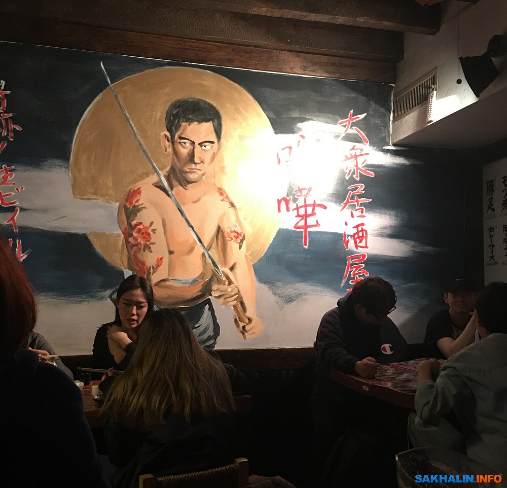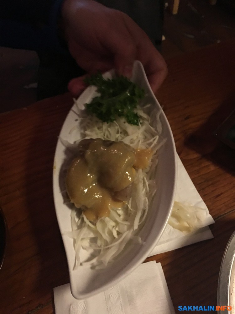 Да, сегодня 8 Марта, и мы хоть его и не отмечаем, на ужине в японском панк-кафе веселья ради и памятуя (говорю о себе) о бурном обсуждении подобных блюд в нашем новом кафе "Соседи" заказываем бычьи яйца и пенис. И то, и другое есть невозможно, а остальная еда вкусная и недорогая.