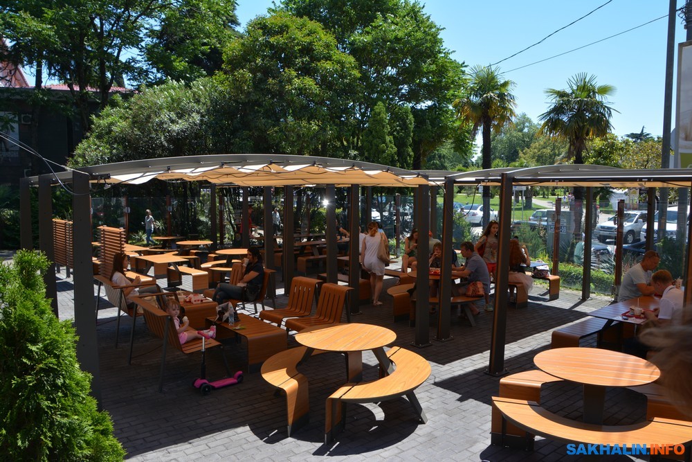 Питание на любой вкус и кошелек. Здесь есть все — от ресторанов и кофеен до сетей быстрого питания и бюджетных столовых. Всюду лотки с холодным квасом и лимонадом.