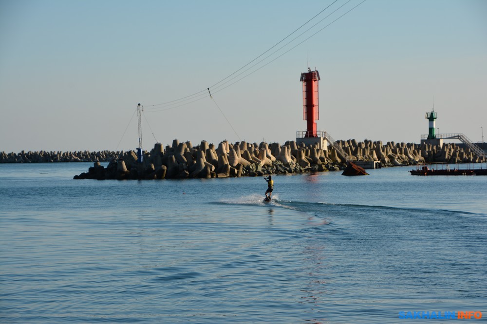 На внешней стороне гавани можно прокатиться на специальной доске, держась за буксировочный трос, подвешенный на стальных тросах над акваторией Черного моря.