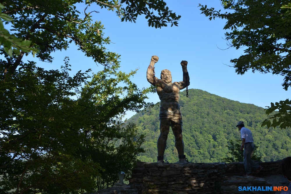 — Сувениры идут не очень, а вот салфетки с изображением Прометея из-под чашечки кофе туристы берут охотно. Американцы — те норовят пепельницы в виде орла стянуть — в один день три штуки исчезли. Из птиц — сапсаны, вчера целый день летали. Как-то туристы на ночёвку остались, чтобы их увидеть. Ниже смотровой площадки находится грот. Попасть в него можно по лестнице из плитняка. Вечером включаем подсветку по краю пропасти, — рассказывает работник комплекса.