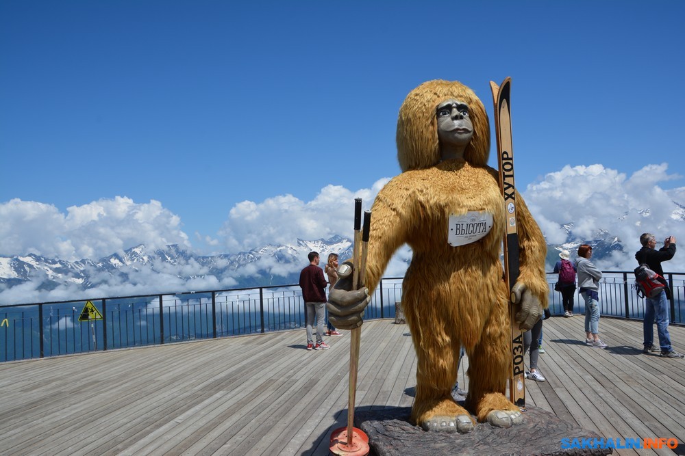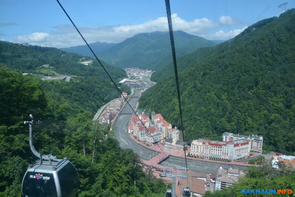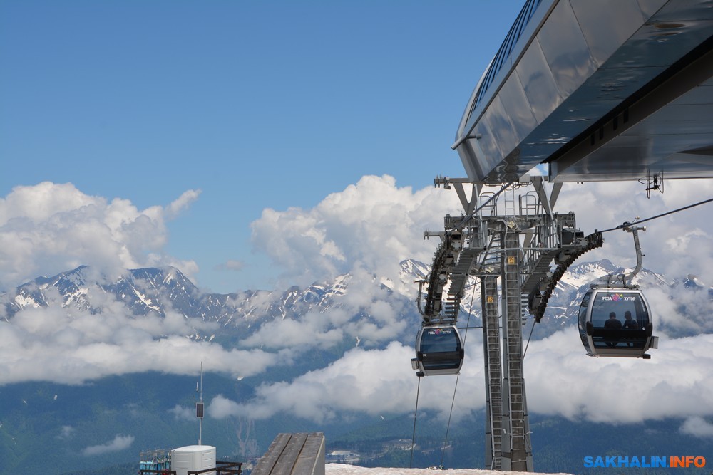 Каждая очередь канатной дороги имеет свое название: Олимпия, Заповедный лес, Кавказский экспресс, Волчья скала, Крокус, Стрела и др., они зимой обеспечивают доступ к лыжным трассам, летом работают в экскурсионном режиме. На канатной станции "Заповедный лес" торгуют кепками с олимпийской символикой. Поднимаемся на вершину "Роза-пик", самую высокую точку Сочи (2320 м). Высокие ели сменяются голыми скалами и каменистыми осыпями, на склонах цветущий рододендрон. Предусмотрена защита от селей.