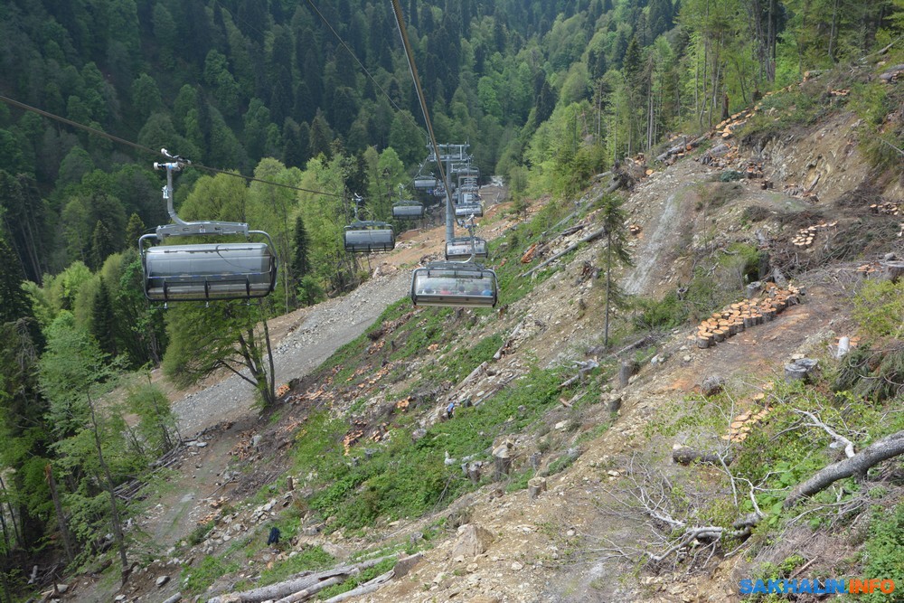 Продолжается прокладка новых канатных дорог. Снесенный строителями лес тут же утилизируется. На склонах видны куски деревьев, подготовленные к вывозу и использованию для обогрева жилищ или в тех же шашлычных.