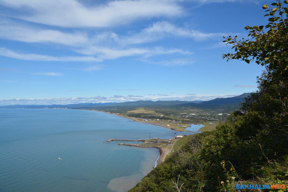 Поднявшись на мыс, сворачиваем на открытую площадку рядом с ретрансляционной станцией. Смотровой площадкой её назвать можно лишь условно. Каких-то ограждений на высоких обрывах не наблюдается. Между тем место посещается туристами, в том числе при содействии историко-литературного музея "А.П. Чехов и Сахалин". Отсюда открывается широкая панорама Александровского залива и прибрежной части города, возникшего в устье Дуйки (Большой Александровки) в 1862 году изначально как Александровский пост.