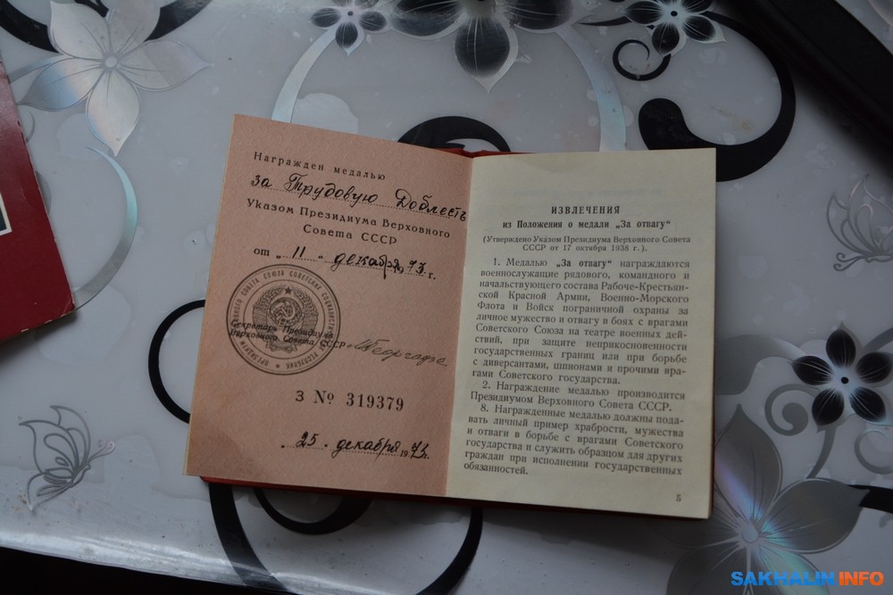 Хозяина дома зовут Алексей Андреевич Кубыра . Всю жизнь проработал в Усково механизатором. 88 лет. 11 декабря 1973 года Алексей Андреевич был награжден медалью "За трудовую доблесть". Символично, что для награждения использован бланк удостоверения о награждении медалью "За отвагу". Кроме того, за долголетний добросовестный труд от имени Президиума Верховного совета СССР решением исполкома Сахалинского областного совета депутатов трудящихся от 25 сентября 1985 года он был награжден медалью "Ветеран труда". В августе 1988 года в связи с 30-летием Кировского совхоза (1958-1988) был занесен в книгу старейших работников совхоза.