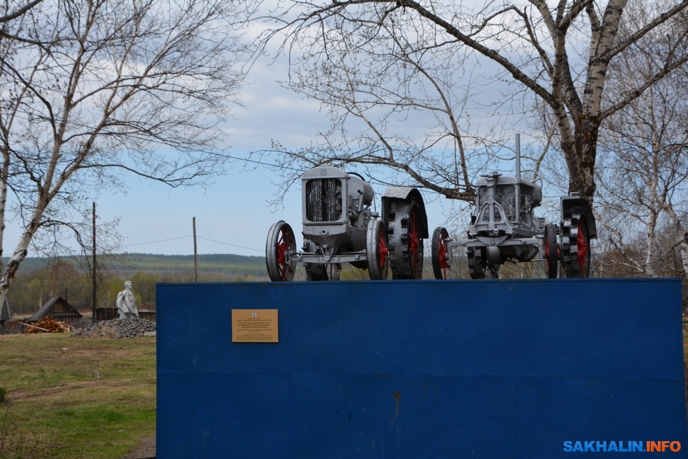 Рядом на постаменте два трактора — памятный знак, установленный в 1970 году в честь организации в 1932 году первой машинно-тракторной станции на Сахалине. Является памятником истории, объектом культурного наследия регионального значения.