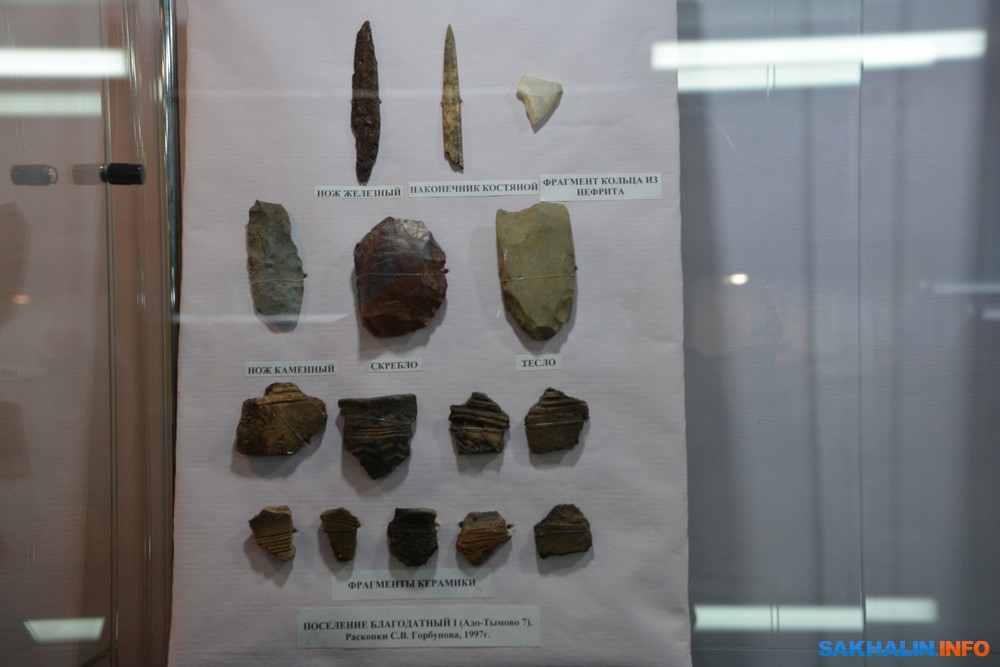 — Сахалин — очень древний остров. Женщина возглавляла лесхоз. Когда она с работниками обследовала местные сопки, случился обвал. Она увидела раковины, торчащие из грунта, рассказала нам... Такие находки свидетельствуют о том, как образовался остров. Горбунов формировал этот раздел. У нас можно увидеть аммониты, а также камни с отпечатками древнейших растений, и не только из нашего района, найденные им. В районе есть облицовочный камень для отделки зданий. В промышленных объемах его никогда не добывали. В годы перестройки приходили молодые предприниматели — хотели сделать маленькую мастерскую по обработке яшмы, сердолика, но что-то не заладилось. На берегу Тыми много яшмы. Когда отсыпают дорогу, её можно найти. Сердолик — морской камень — собирали в Александровске-Сахалинском. Горный хрусталь, россыпь янтаря. Наш обработанный янтарь — чайного цвета с насекомыми внутри — лучше, интереснее балтийского. Все это хозяйство С.В. Горбунова. Он постоянно проводит мастер-классы по археологии и первобытной технике изготовления орудий труда для студентов и школьников. Темами его лекций являются вопросы этнографии, археологии, палеонтологии, результаты его многочисленных экспедиций по Сахалину и Японии.