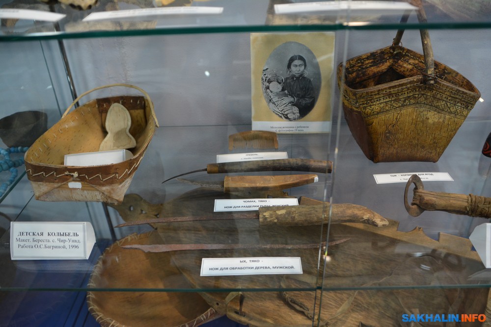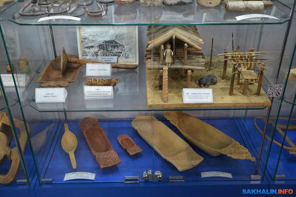 В музее богатая этнографическая коллекция. Деревянная скульптура Владимира Адаменко "Девушка-эвенка". Нивхский уголок. Среди предметов — колчан, народные музыкальные инструменты, оригинальные люлька младенца и корзинка для ягод. Все мелкие экспонаты вырезаны позднее — новоделы. В айнской экспозиции примечательны стеклянные бусы.