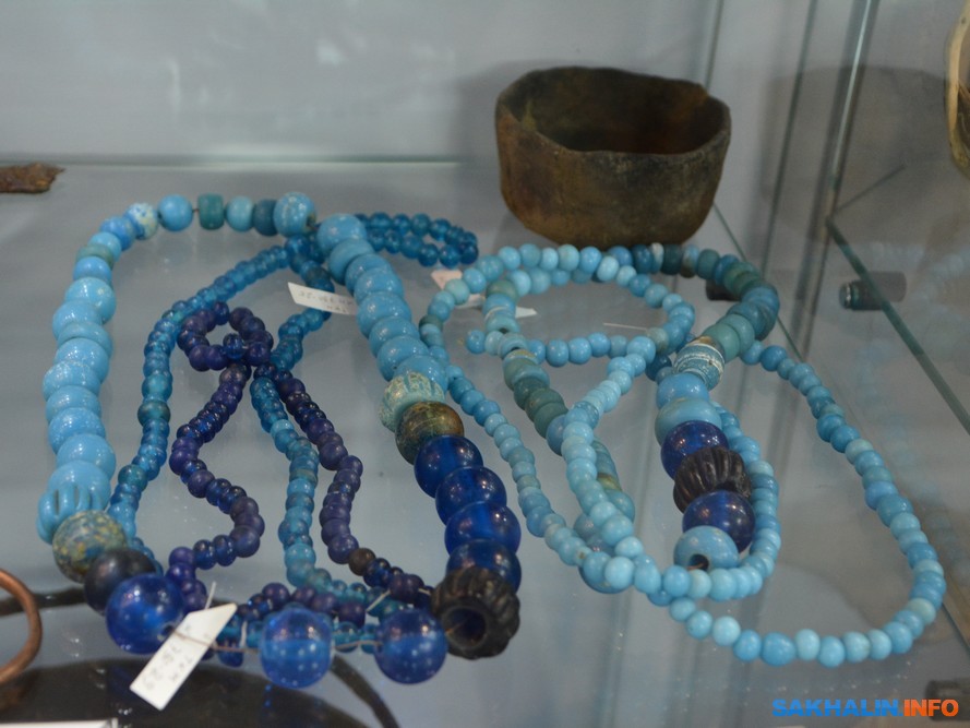 — Появление айнских украшений на Сахалине исследователи объясняют существованием давней торговли с китайцами и японцами. Сергей Горбунов предполагает, что айны вполне могли сами владеть технологией изготовления стекла из песка. Места нет, чтобы все показать. Экскурсия по нивхам есть. Лодка-долбленка. Нарты — их запрягали собаками. Оленей, которые служили транспортным средством эвенкам, в Тымовском округе теперь нет. Ближе к устью Тыми если только...