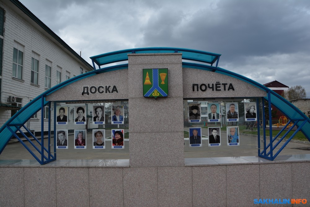 На въездной стеле — герб Тымовского района. Его основная фигура — опрокинутый вилообразный крест — показывает реки Тымь и Поронай, в долине которых расположен район. Золотая ель указывает на богатые лесные хозяйства района, а сноп — на интенсивное освоение сельскохозяйственных земель. Золото символизирует также природные богатства района.