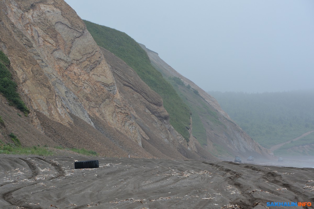 Перед Птичьим озером спускаемся к морю. Дороги тут нет совсем. Машины идут по песку, каждая по своей траектории, оставляя глубокие колеи. Птичье озеро находится на восточном побережье Тонино-Анивского полуострова между мысами Птичий Нос и Менапуцы и соединяется с морем протокой. Иногда ее замывает во время штормов, и её можно благополучно преодолеть по образовавшейся плотине-перемычке шириной 50-100 метров, как и на этот раз.
