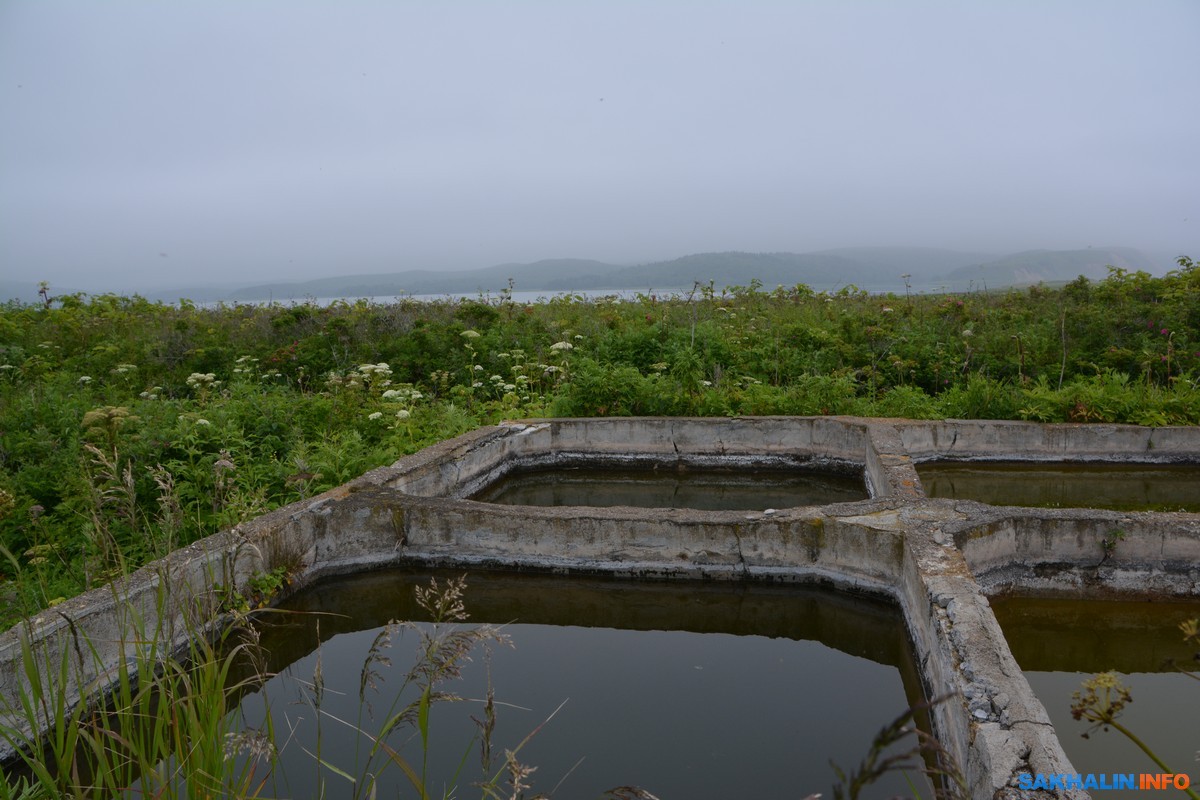 На берегу японские чаны для засолки рыбы. Они наполнены дождевой водой. Крепкий бетон крошится от времени.