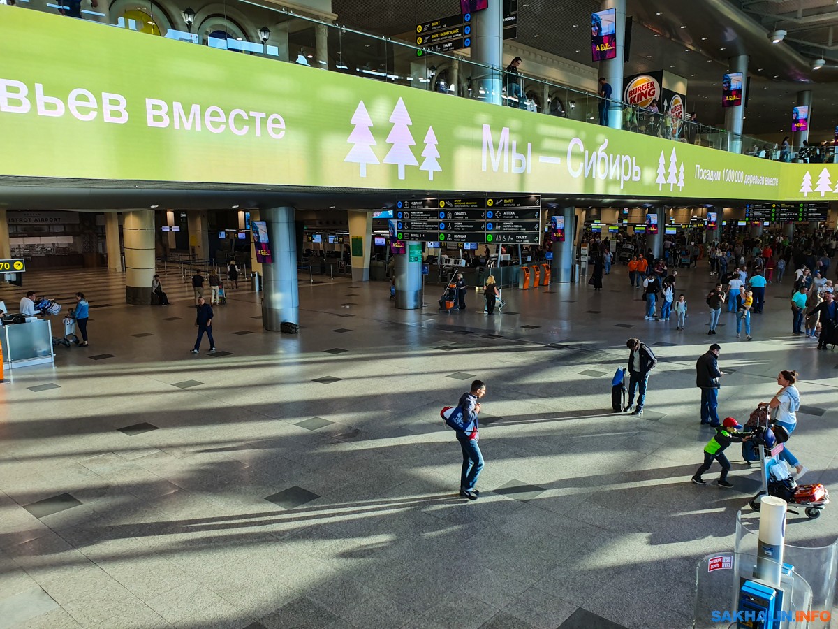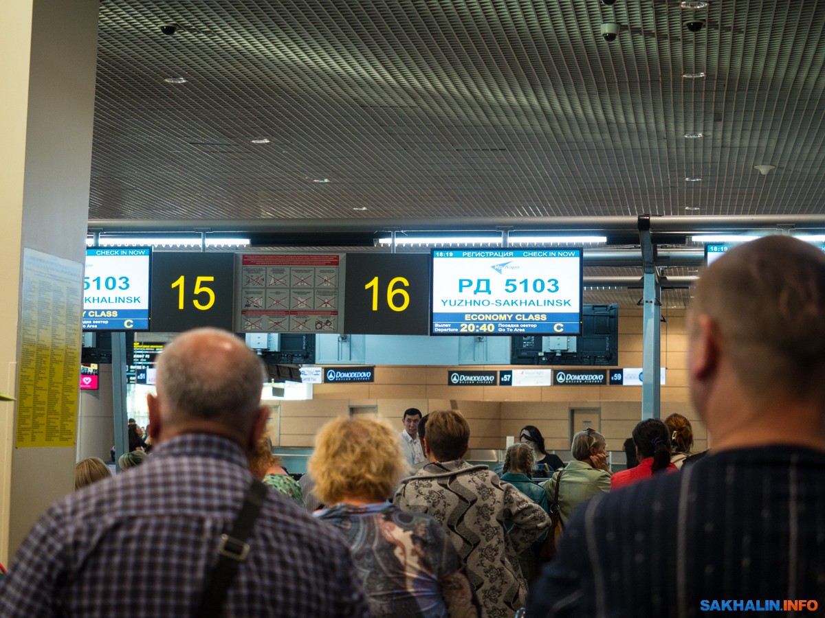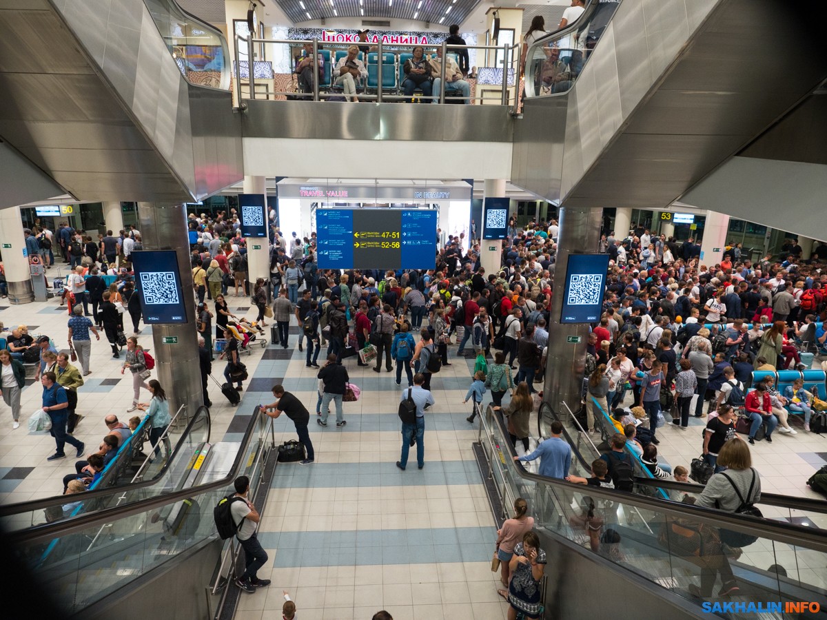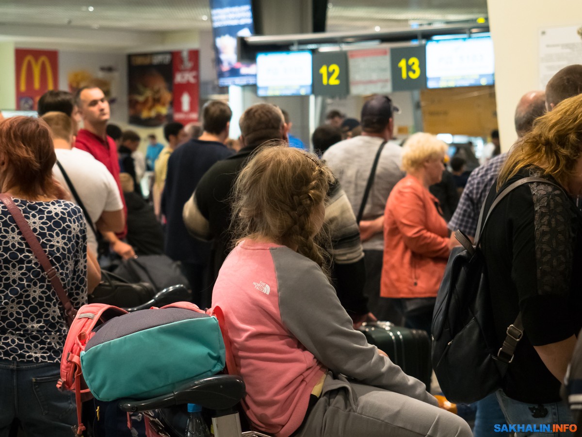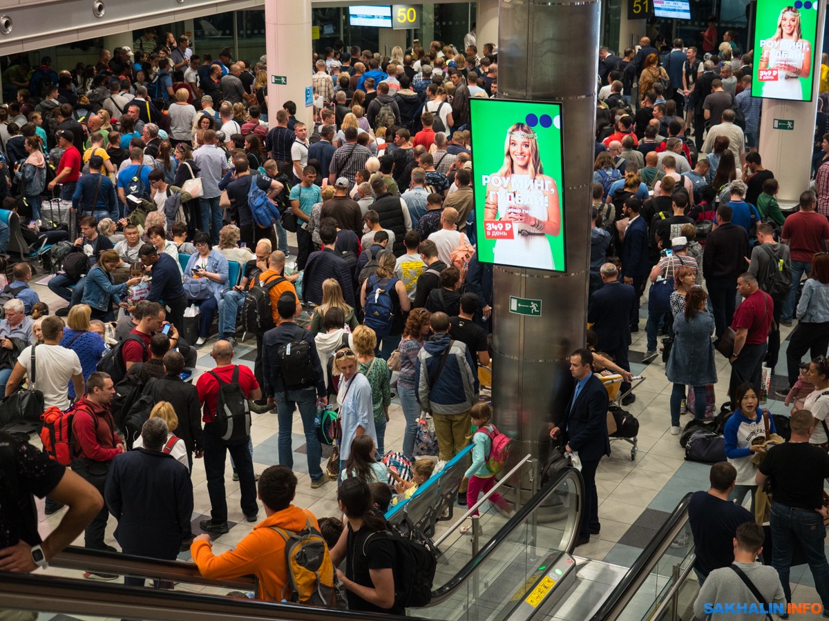 Вот все эти люди у гейта стоят в ожидании, когда объявят посадку на Южно-Сахалинск.