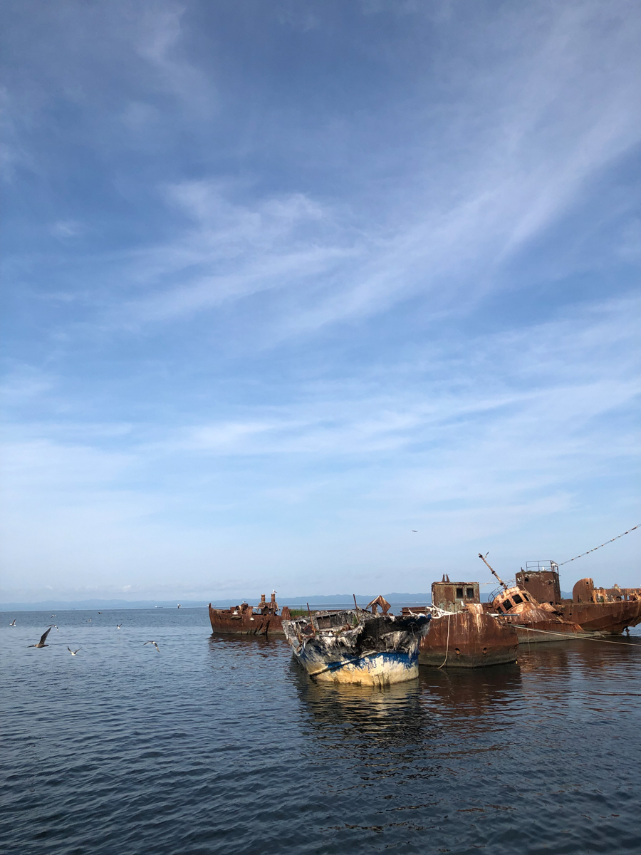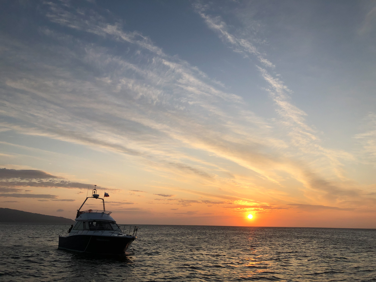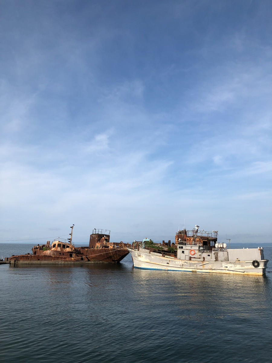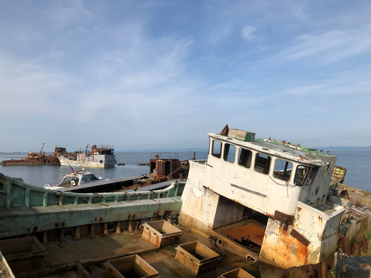 Утром на трёх машинах, забитых до отказа вещами, снаряжением и оборудованием (вместе с нами была ещё съемочная группа документалистов, вооружённая до зубов дронами, стедикамами и прочими прибамбасами), мы отправились в Корсаков. Отчаливали мы не из главного порта, а из какой-то бухты, где раньше располагался яхт-клуб, а теперь там стоянка частных катеров и кладбище живописно ржавеющих посудин.