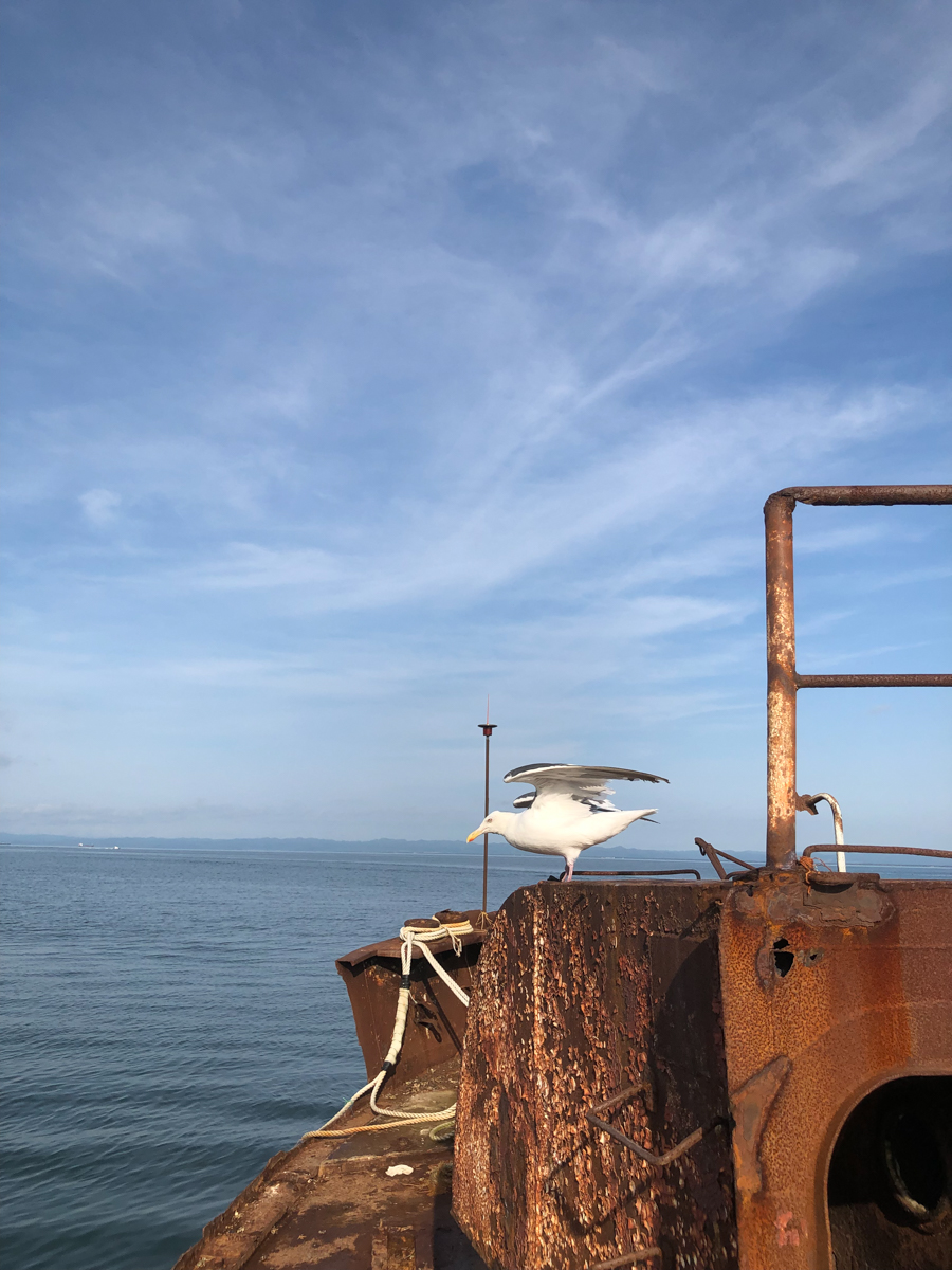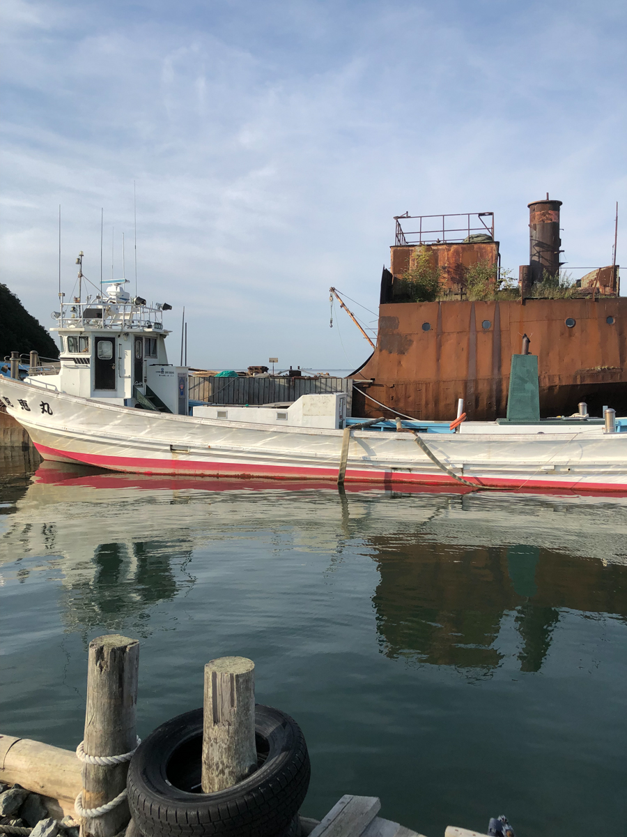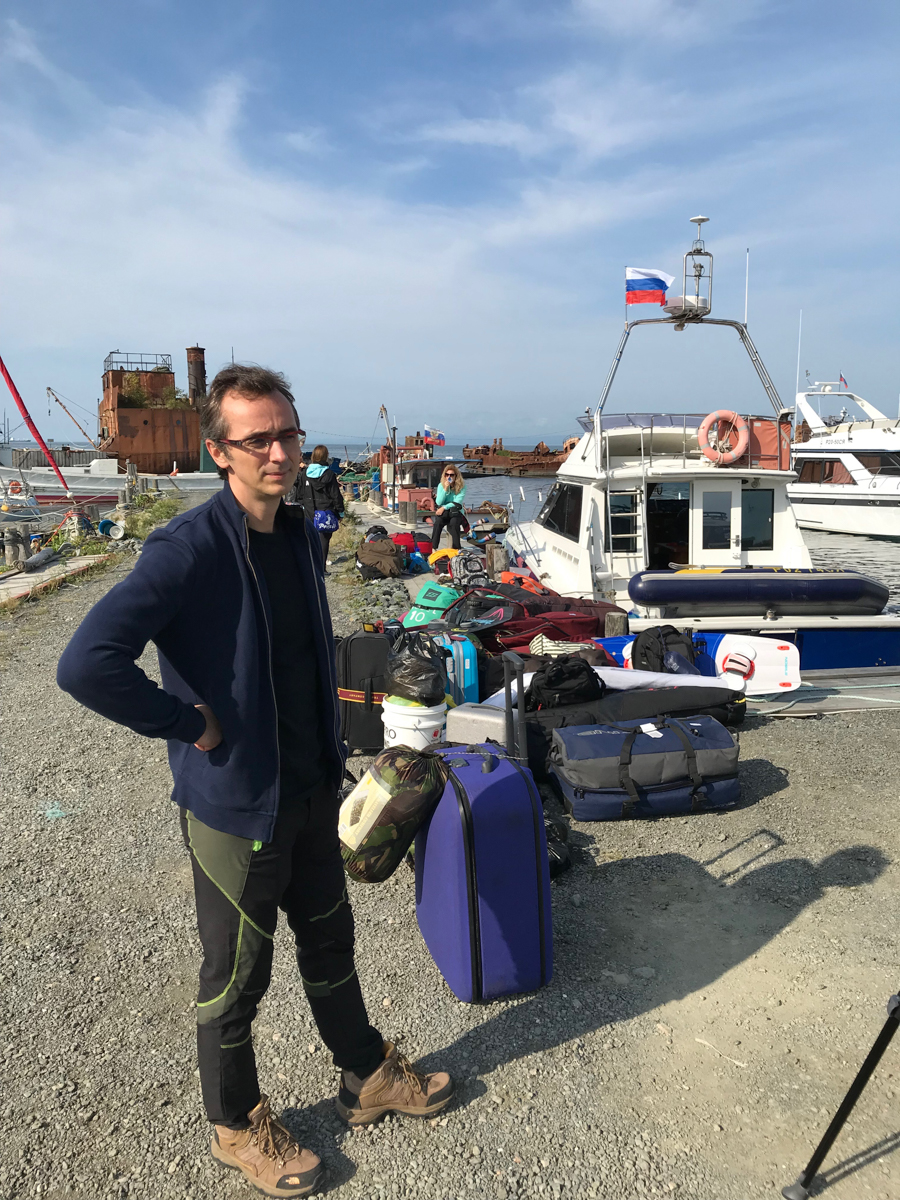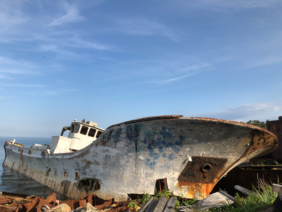 Утром на трёх машинах, забитых до отказа вещами, снаряжением и оборудованием (вместе с нами была ещё съемочная группа документалистов, вооружённая до зубов дронами, стедикамами и прочими прибамбасами), мы отправились в Корсаков. Отчаливали мы не из главного порта, а из какой-то бухты, где раньше располагался яхт-клуб, а теперь там стоянка частных катеров и кладбище живописно ржавеющих посудин.