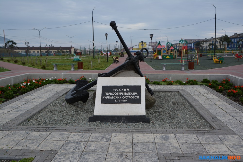 На главной площади Южно-Курильска установлен памятник "Русским первооткрывателям Курильских островов. 1739-1989".