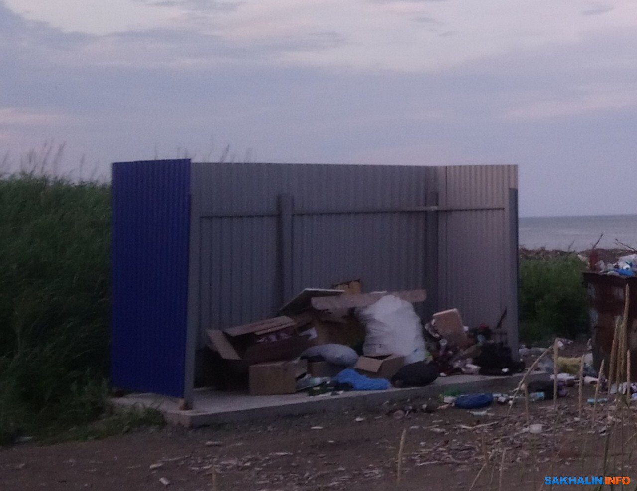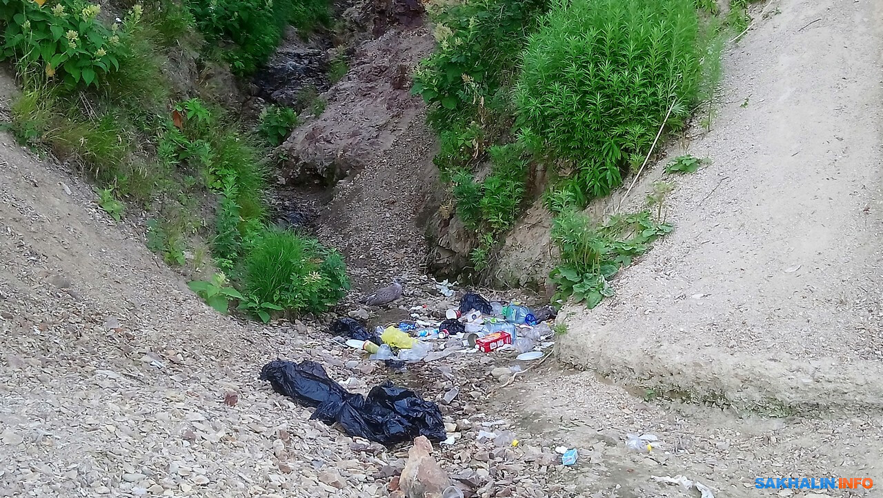 Во второй наш заезд в бухту Тихую, через неделю, мы были неприятно удивлены, увидев, что на ручейке, впадающем в море, где с крутого песчаного склона свисает канат, устроена свалка-туалет. Ещё неделю назад никакой свалки тут не было. Такой вот привет от туристов, отдыхавших в выходные. На свалке сидела серая чайка, видимо, кормилась оттуда. Наличием этой свалки показал свою суть нынешний туризм по-сахалински. Думаю, ребятам из народного природного парка не очень приятно всё это расчищать.