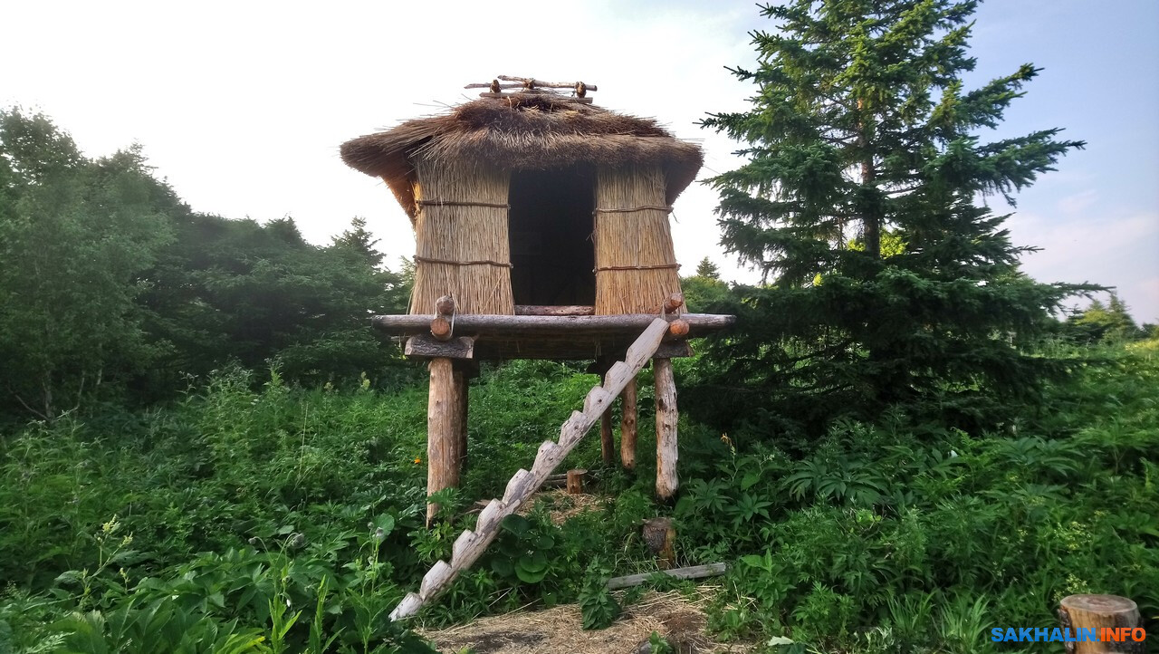Наличие в округе табличек-указателей и проложенных троп, признаться, порадовало. Не припомню этих троп, когда мы заходили на Жданко со стороны Тихой в 2014 году. Может быть, они и были, но явно не настолько натоптаны и удобны для ходьбы. Заинтересовала нас и избушка из тростника, находящаяся на склоне на подходе к мысу Красному, в глубине леса. Избушка добротно сделана, и, как сообщают информационные таблички внутри, она представляет собой модель айнского хозяйственного амбара. На стенах также имеются небольшие стенды с информацией о растениях, произрастающих в округе. На полу лежат туристические коврики, так что можно заночевать, но лютый гнус вряд ли это позволит, учитывая отсутствие дверей.